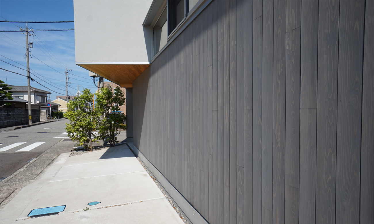 計画地の野々市市横宮町は近隣商業地域で 地区内の道路に沿って店舗系の建物が多く並んでいます。しかし地区外の道路を挟んで隣接する向かいは 木造家屋の並ぶ住宅地です。これら二つの異なる性格の道路に面した角地に計画した住宅です。