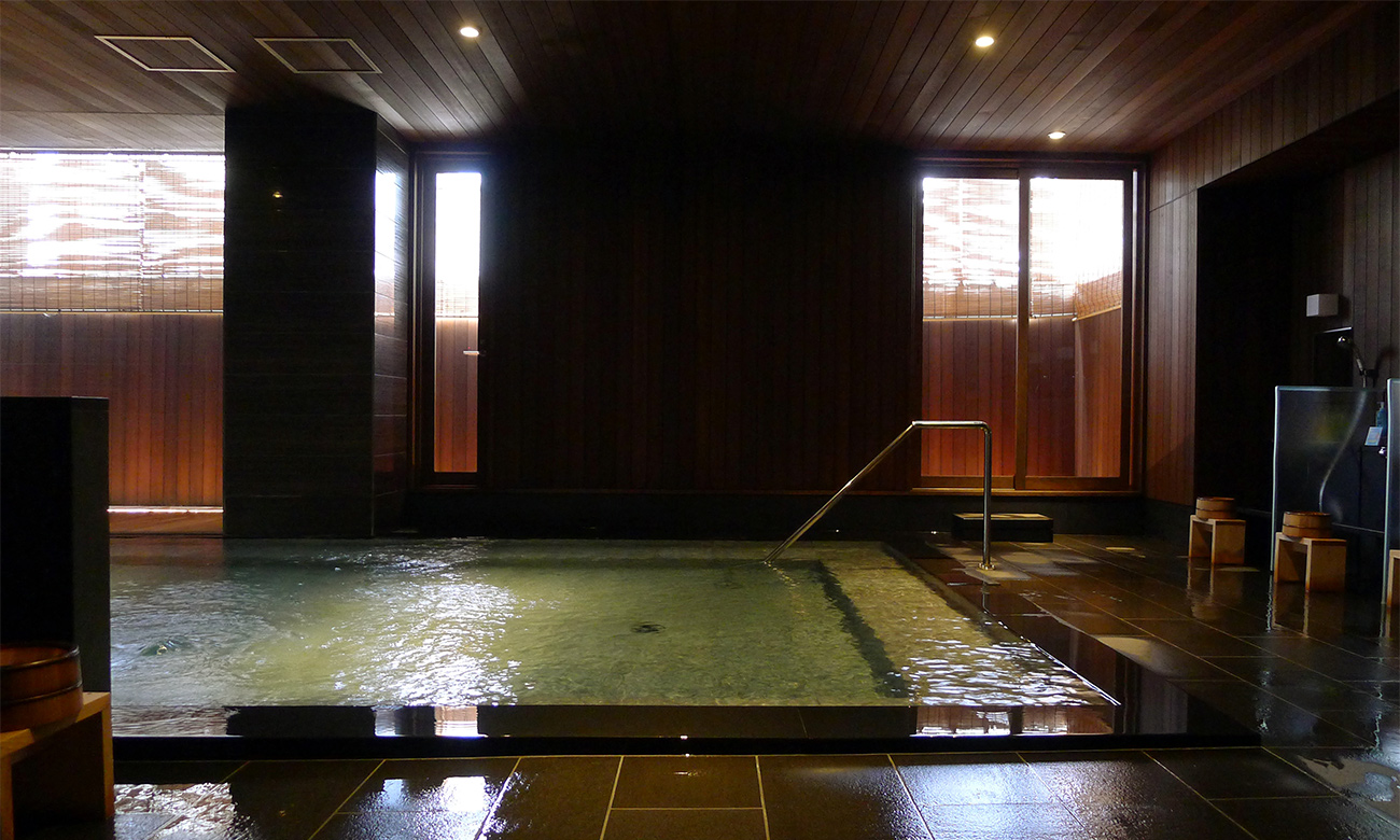 The work here is a refurbishment of the Hotel Kikyou’s large old public bath. The owners wanted to create new outer baths within the limited space available on the first and second floors, incorporating a marked contrast between bright and dark, and with interchangeable men’s and women’s bathrooms for the morning and evening. We proposed the creation of a large combined space for the inner and outer bathrooms by unifying them in terms of their forms and materials.